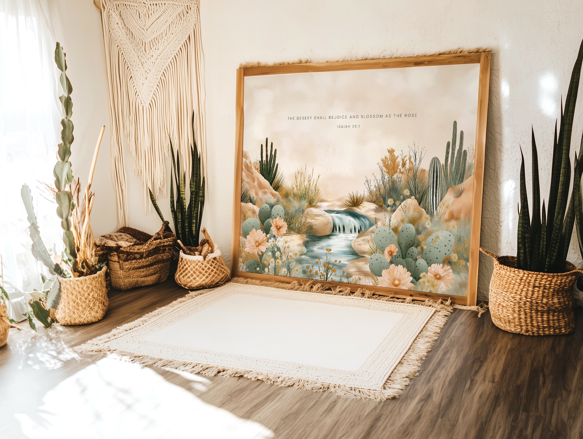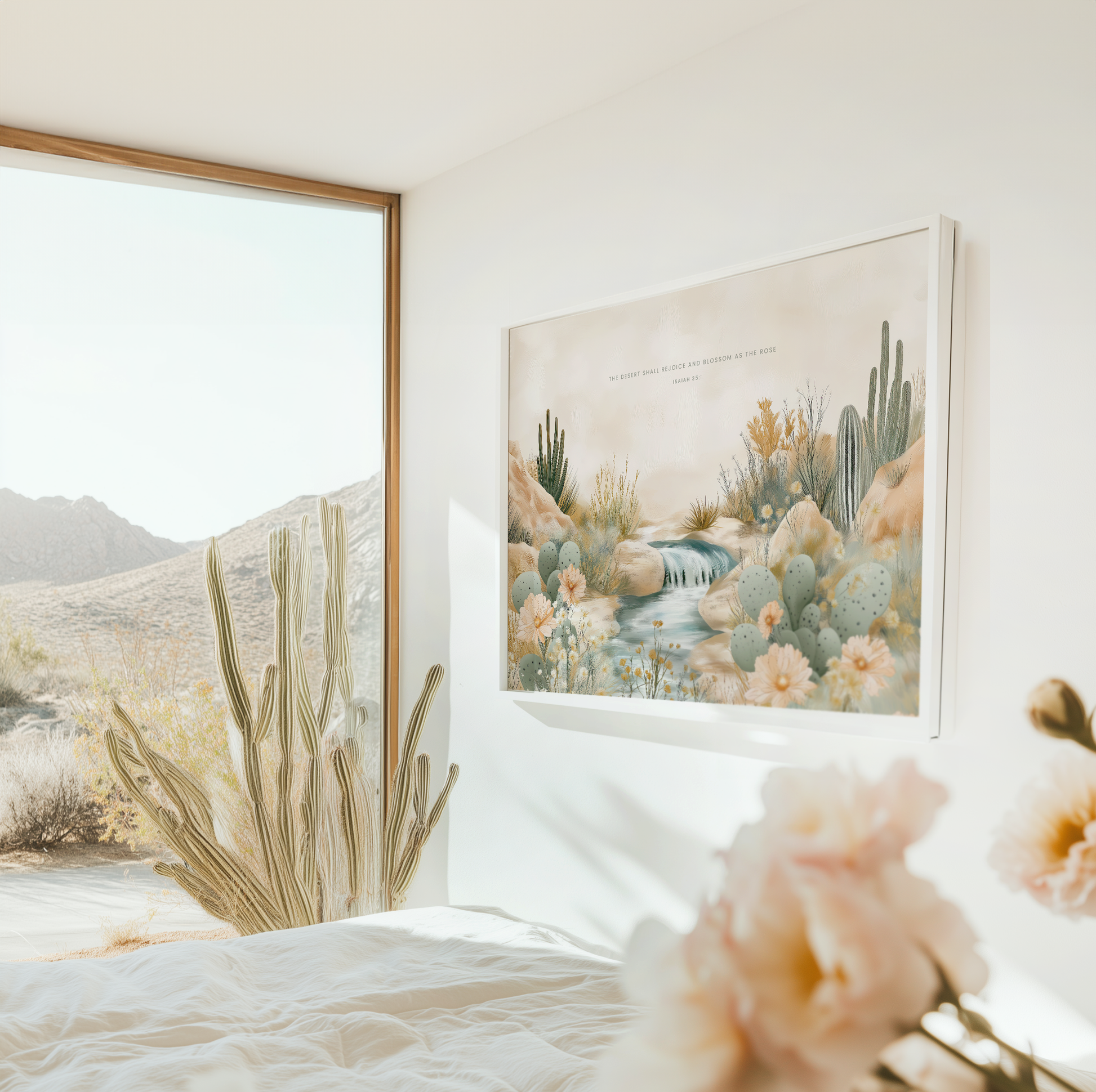 This artwork captures the promise of hope and renewal amidst a desert landscape. With earthy tones, blooming cactus flowers, and peaceful water flowing through rugged terrain, this piece is the perfect scripture artwork for your space.