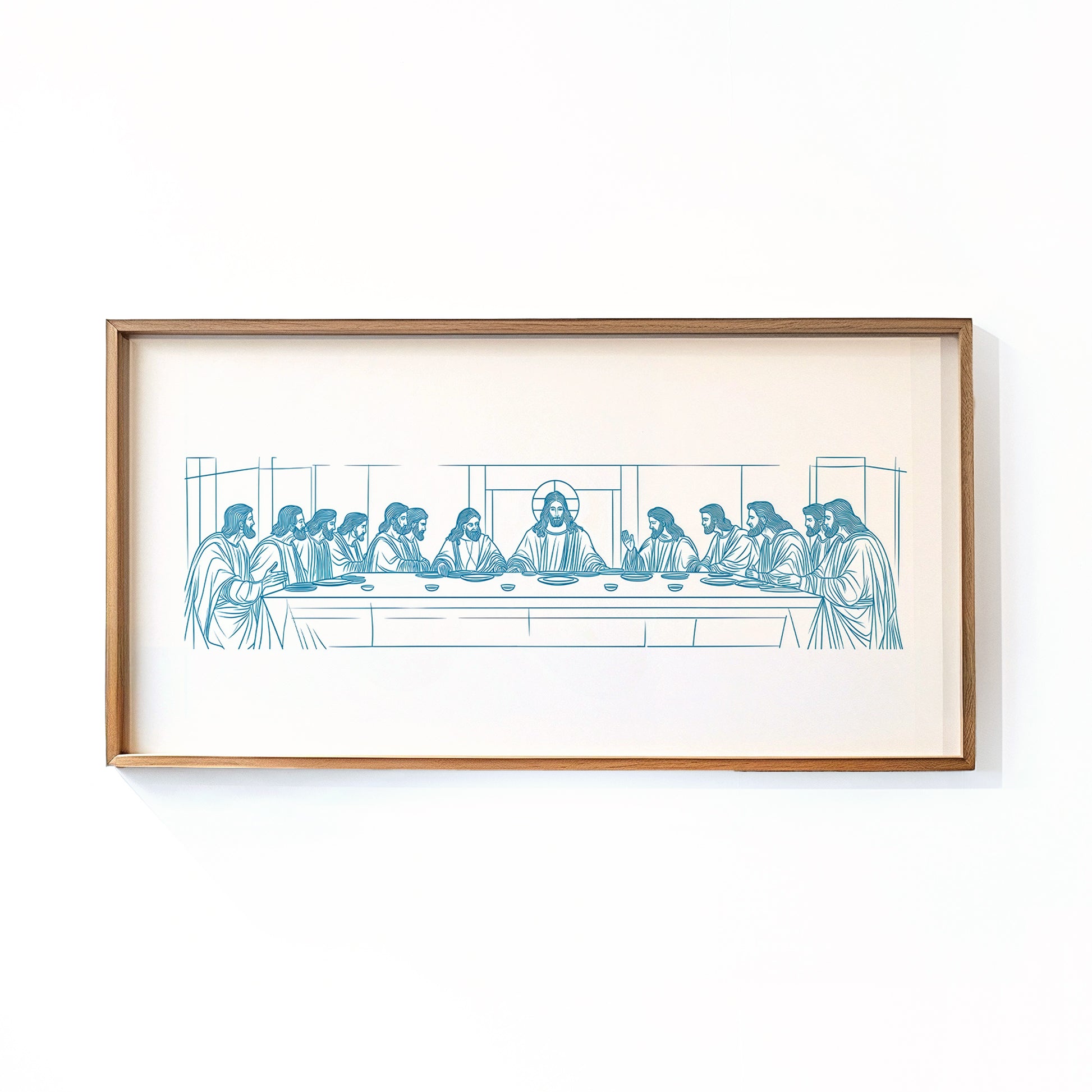 This Last Supper painting is reimagined in a modern minimalist style, offering a fresh take on one of the most beloved biblical scenes. With clean blue line drawing, this Christian artwork beautifully depicts Jesus and His disciples gathered around the table, reminding us of fellowship, remembrance, and the promise of faith. The simplicity of the design combined with its contemporary color palette makes it versatile and timeless. Perfect for blending into modern Christian décor trends such as minimalist, boho chic, and farmhouse interiors, this piece adds both meaning and style to your space. Ideal for your dining room, kitchen, prayer corner, or church gathering space, this religious wall art also makes a thoughtful gift for housewarmings, weddings, Easter, or Christmas.