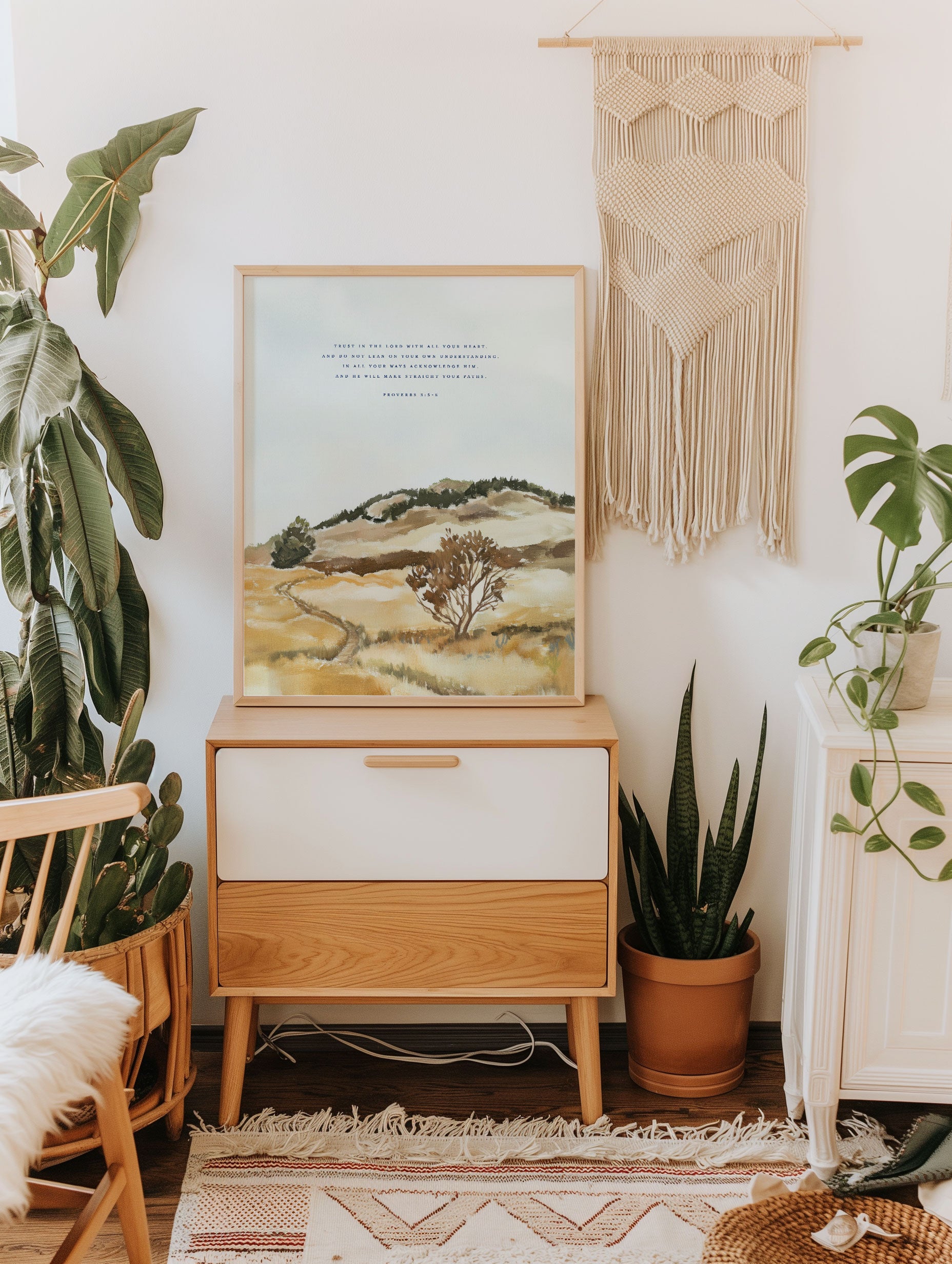 Let this peaceful and faith-filled art print be a daily reminder to lean not on your own understanding, but to Trust in the Lord with all your heart. Featuring Proverbs 3:5-6 in elegant modern serif typography above a softly painted pastoral landscape, this piece brings calm and spiritual encouragement to any space. With its earthy tones and modern minimal style, this unframed print pairs beautifully with neutral home decor, making it a thoughtful addition to a living room, prayer corner, office, or entryway. It also makes a meaningful Christian gift for birthdays, baptisms, weddings, housewarmings, or encouragement in a time of transition.